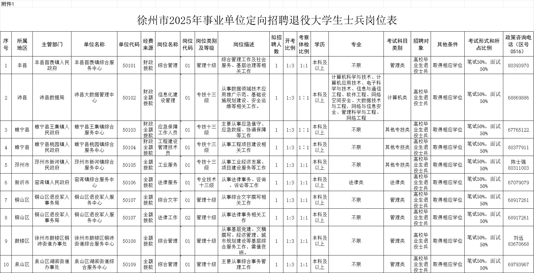 1.徐州市2025年事业单位定向招聘退役大学生士兵岗位表